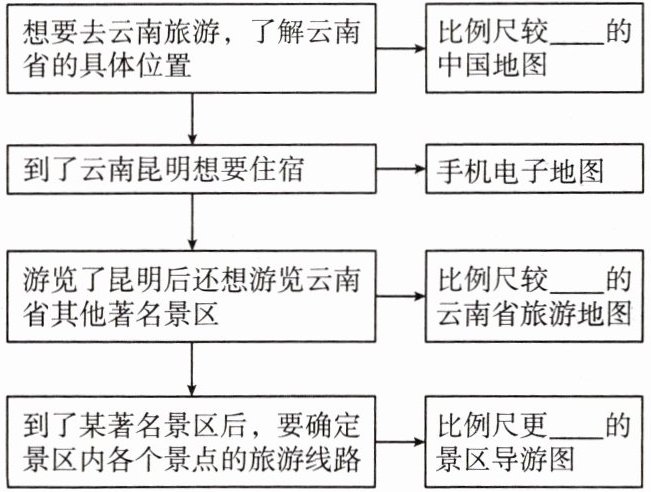 游览了昆明后还想游览云南省其他著名景区 → 比例尺较____的云南省旅游地图