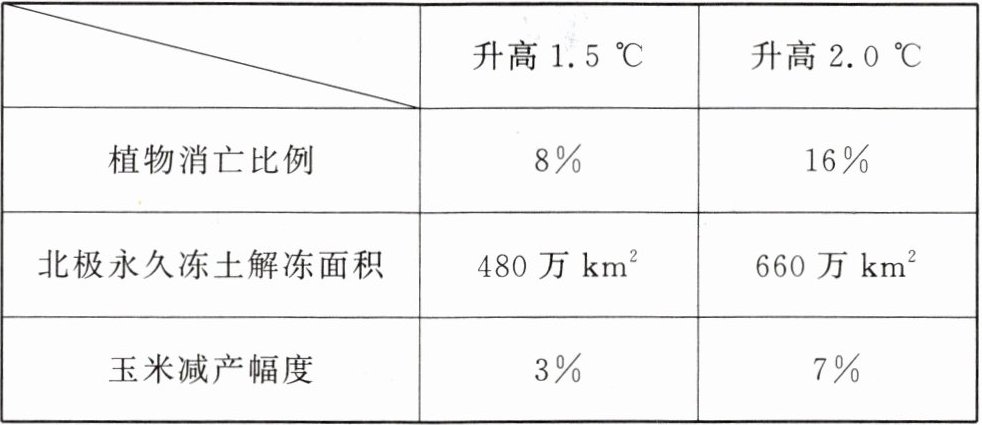 知识拓展:据世界气象组织常年对全球气温监测发现,全球气温不断上升。联合国气候变化专门委员会发布《全球升温1.5℃特别报告》,部分指标见下表。