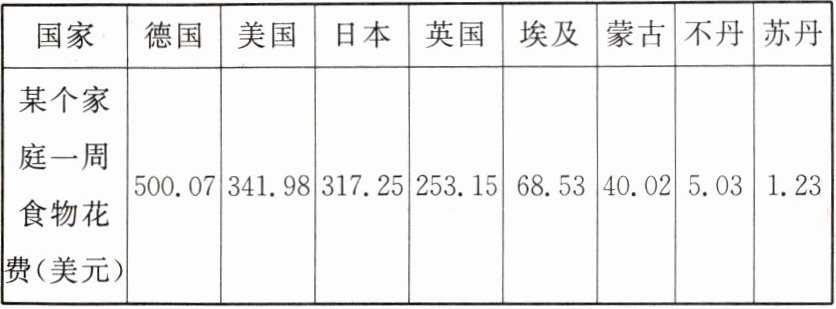 |某个家庭一周食物花费(美元)|500.07|341.98|317.25|253.15|68.53|40.02|5.03|1.23|