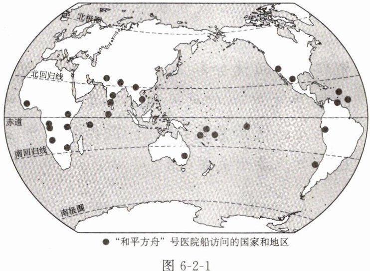 (遂宁中考)“和平方舟”号医院船是中国专门为海上医疗救护的专业大型医院船。该船先后为45个国家和地区提供免费人道主义医疗服务。处处践行构建人类命运共同体的理念,体现出大国的担当。下图为该船访问的部分国家和地区分布示意图。读图,完成4~5题。