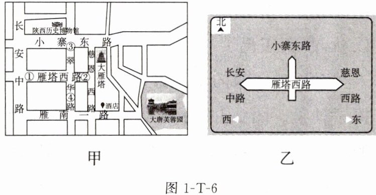 (山西中考改编)山西某中学组织“探秘古都西安,穿越历史岁月”游学活动。游学行程为:酒店—大雁塔—陕西历史博物馆—大唐芙蓉园。图甲是游学景点分布图,图乙是某路牌指示图。读图,完成12~14题。