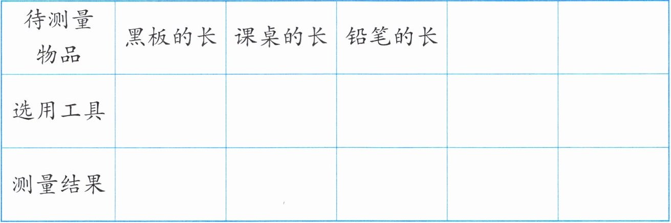 答案:待测量物品:黑板的长、课桌的长、铅笔的长;