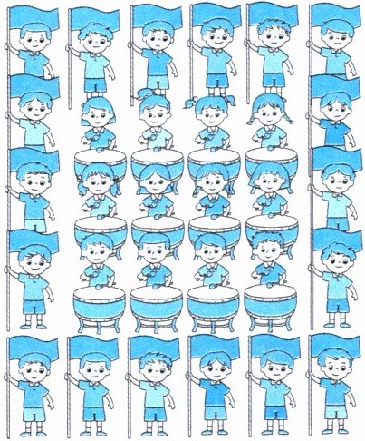 (1) 观察图片可知,打鼓的同学排成3行,每行4人,根据乘法的意义,求几个相同加数的和的简便运算用乘法,所以打鼓的同学人数为行数乘以每行的人数,即$3×4 = 12$人。