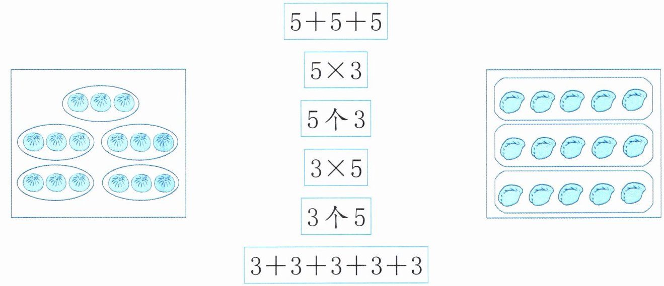 答案:$3×2$可以表示$2$个$3$相加,即$3 + 3 = 6$;也可以表示$3$个$2$相加,即$2+2+2 = 6$。