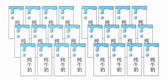 (算式意义:左图乘法表示4排牛奶,每排6盒,共24盒;除法表示24盒牛奶,每4盒一排,可分6排。右图乘法表示3排学生,每排7人,共21人;除法表示21人,每3人一排,每排7人。)