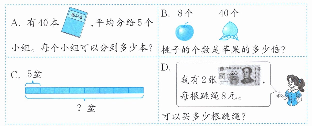 )。(填字母)②能用40÷8解决的问题是(