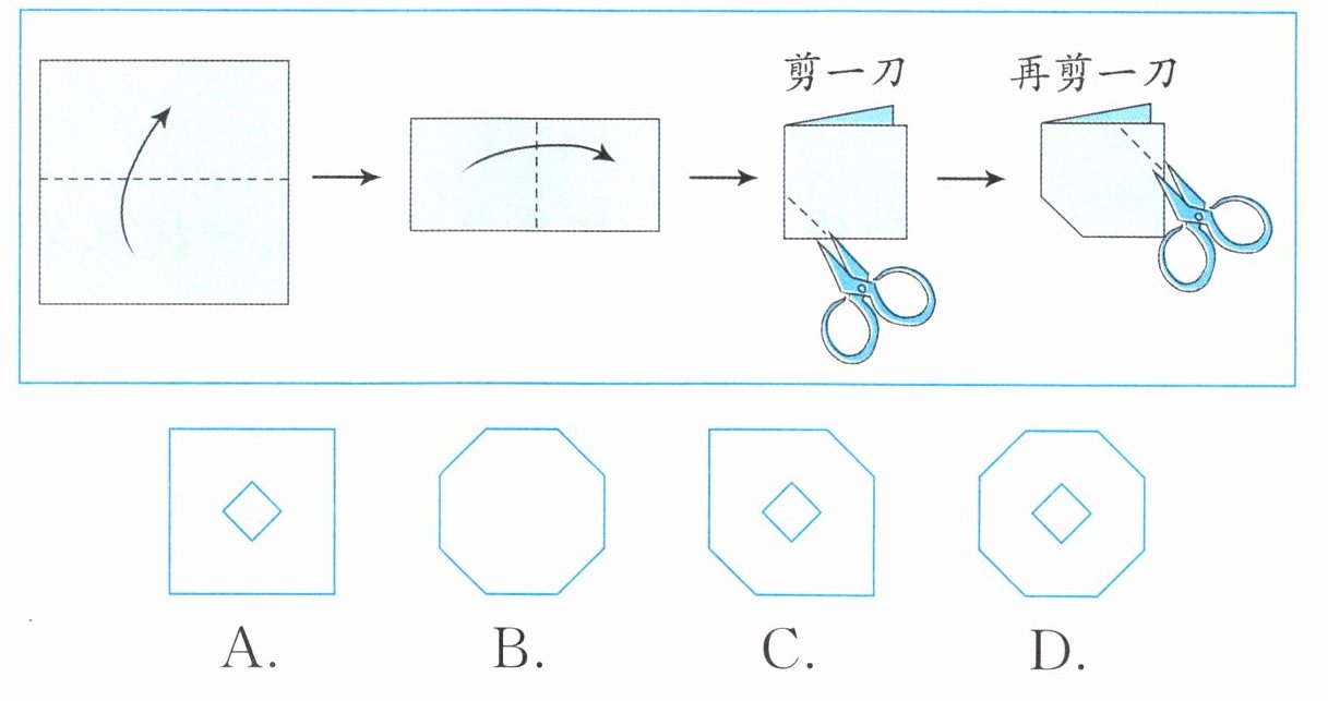 第二步,在已经剪过的图形基础上再折叠一次,然后剪一刀,展开后得到的图形会有两条对称轴(两条折痕所在的直线)。