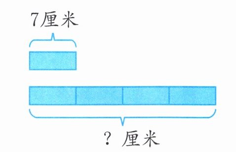 (1)观察图片可知,上面是$2$份长度,每份为$7$厘米,下面是$5$份长度,求下面一共有多少厘米,就是求$5$个$7$是多少,用乘法计算。