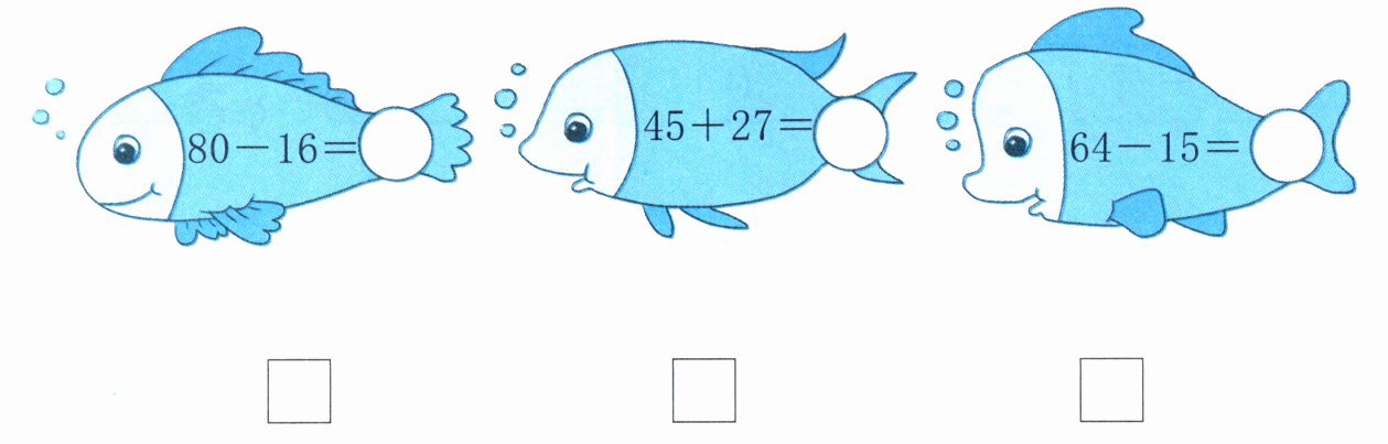 答案:$80 - 16 = 64$;$45 + 27 = 72$;$64 - 15 = 49$。