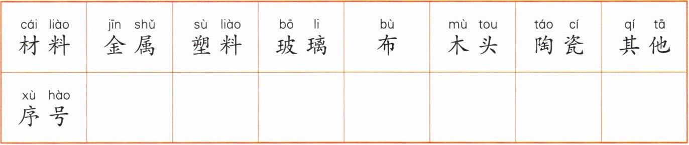 题目考查的知识点是物品的材料分类,通过观察和识别不同物品的材料,将它们正确分类。