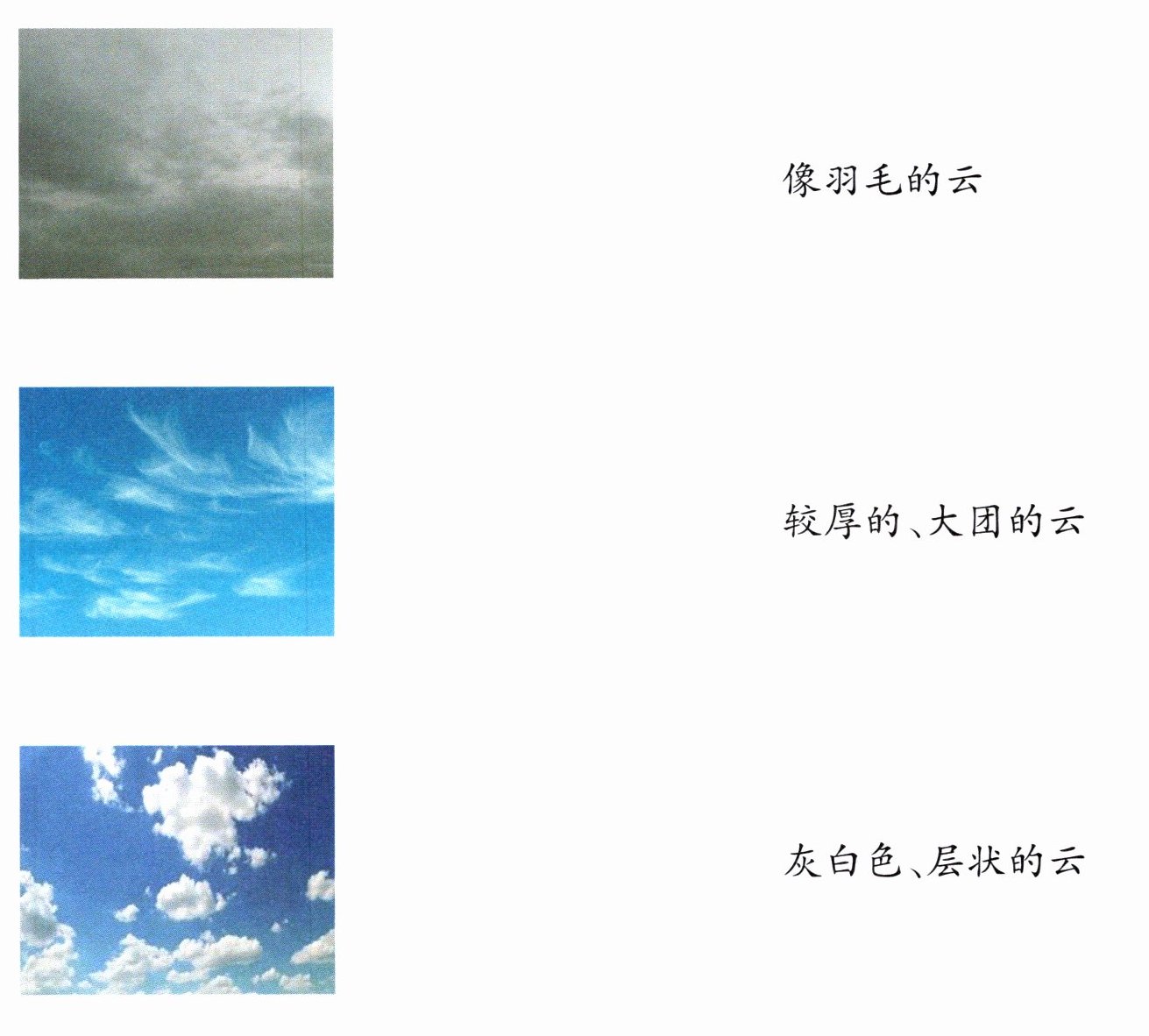 像羽毛的云连第二幅图;较厚的、大团的云连第三幅图;灰白色、层状的云连第一幅图。