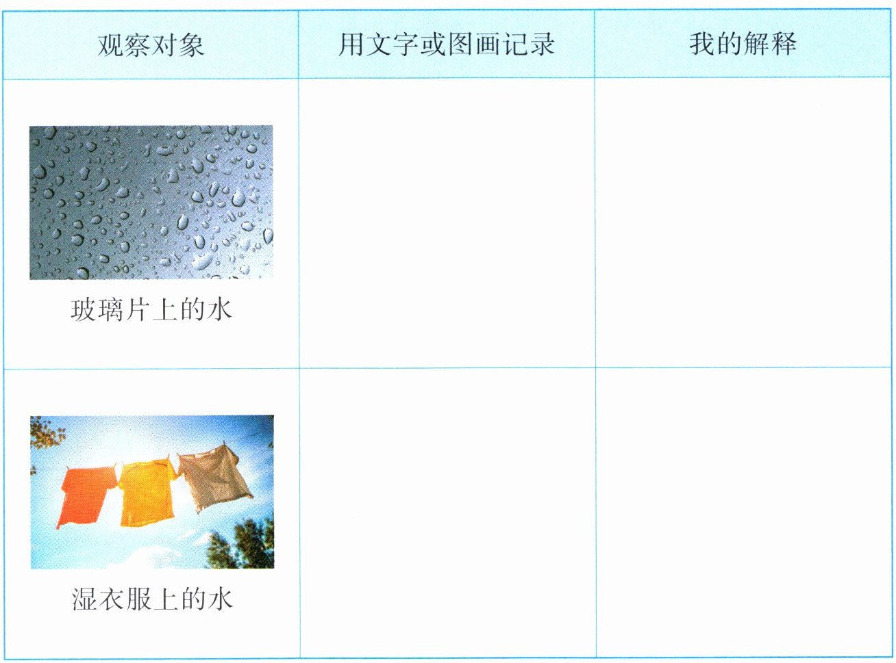|玻璃片上的水|水慢慢变少,最后玻璃片变干|水变成水蒸气跑到空气中去了|