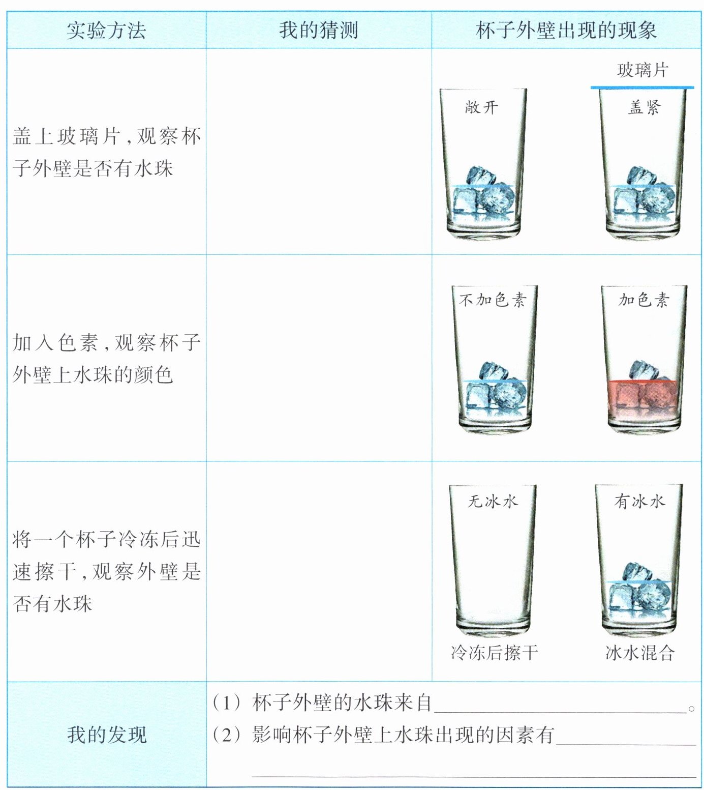 本题主要考查对生活中常见科学现象的观察和推理能力,通过不同实验方法来探究杯子外壁水珠的来源以及影响水珠出现的因素。