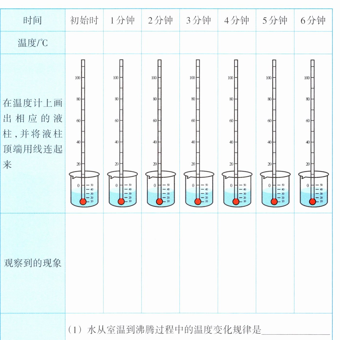 对于在温度计上画出相应的液柱,并将液柱顶端用线连起来的部分,可以根据记录的温度数据,在温度计上标出对应时间的液柱高度,然后用线将这些液柱顶端连起来,形成一条温度变化曲线。