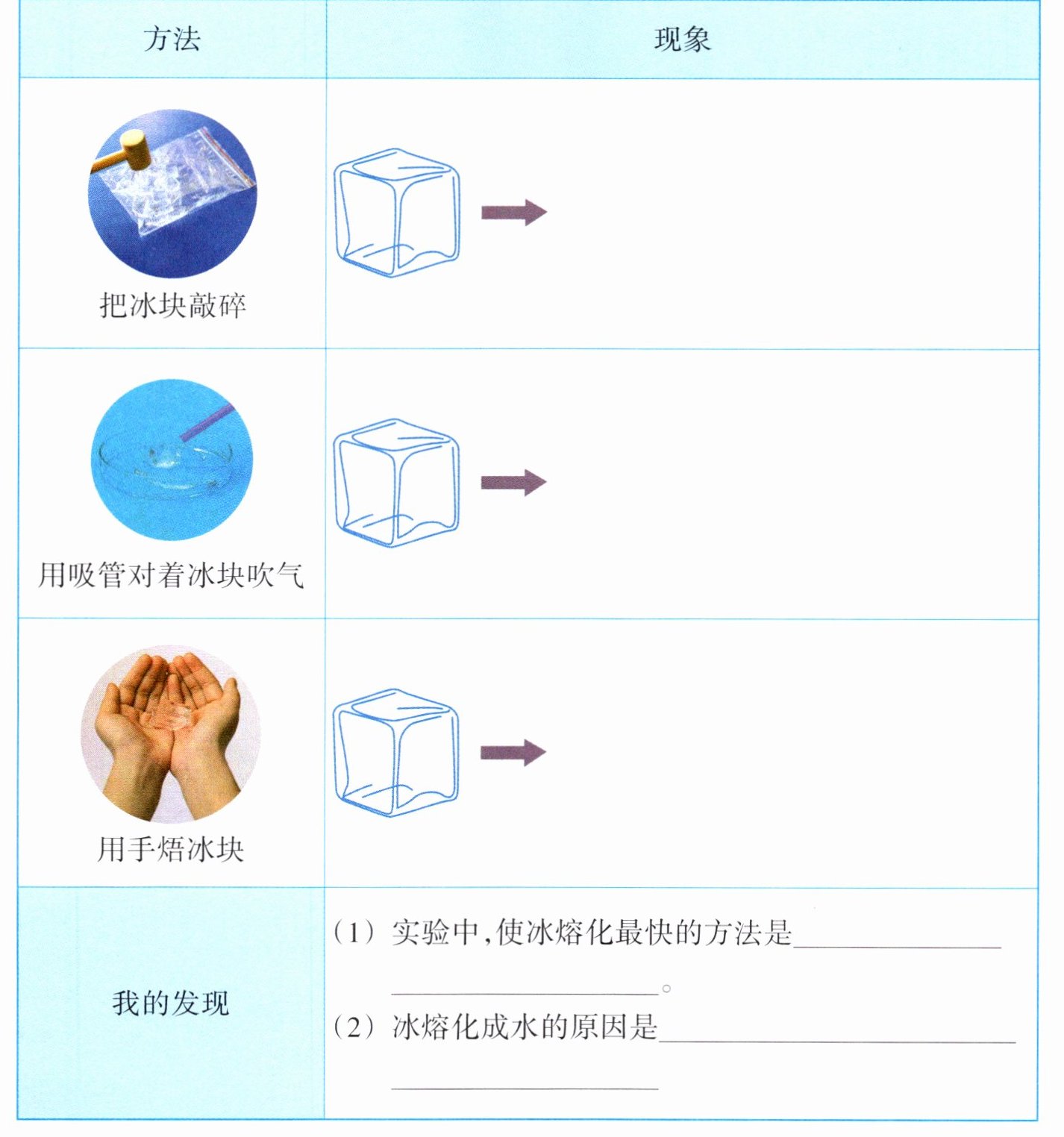 |我的发现|(1)实验中,使冰熔化最快的方法是