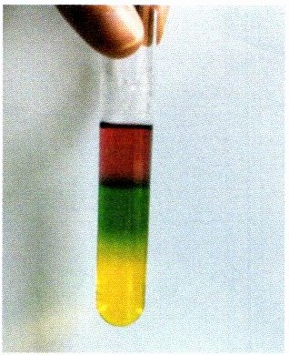 将试管稍微倾斜,用滴管沿试管壁缓慢注入黄、蓝、红色水,观察分层现象。