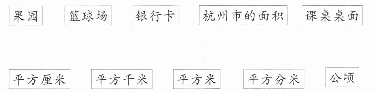 答案:果园——公顷;篮球场——平方米;银行卡——平方厘米;杭州市的面积——平方千米;课桌桌面——平方分米。