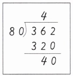 错误:商4偏小,余数40小于除数80,但实际商应为4余42(原计算余数正确,商正确,无需修改,此处可能题目无错,若按常规检查,原计算正确。若题目设定有错误,则可能为商的位置或余数问题,但根据现有信息,原计算80×4=320,362-320=42,原余数写成40,此处错误)