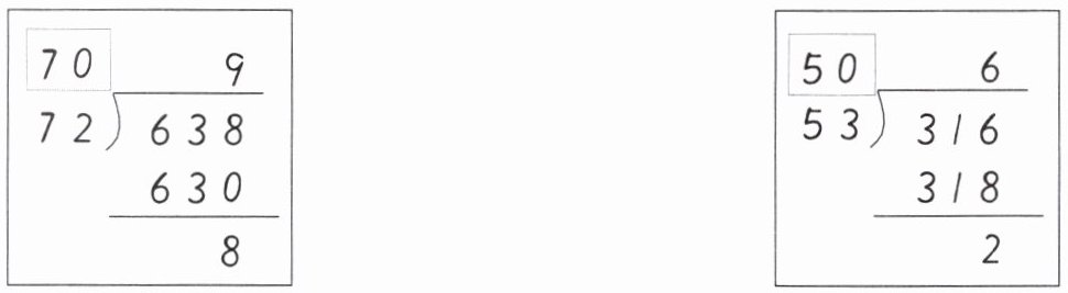 在计算$638÷72$时,把$72$看作$70$来试商,商$9$,$72×9 = 648$,$648\gt638$,说明商$9$大了。