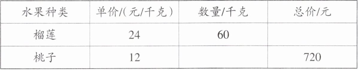 对于榴莲:已知榴莲的单价是$24$元/千克,数量是$60$千克,根据上述公式可得总价为:$24×60 = 1440$(元)。