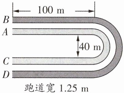 设内跑道半圆的半径为r米,则相邻外跑道半圆的半径为(r+1.25)米。