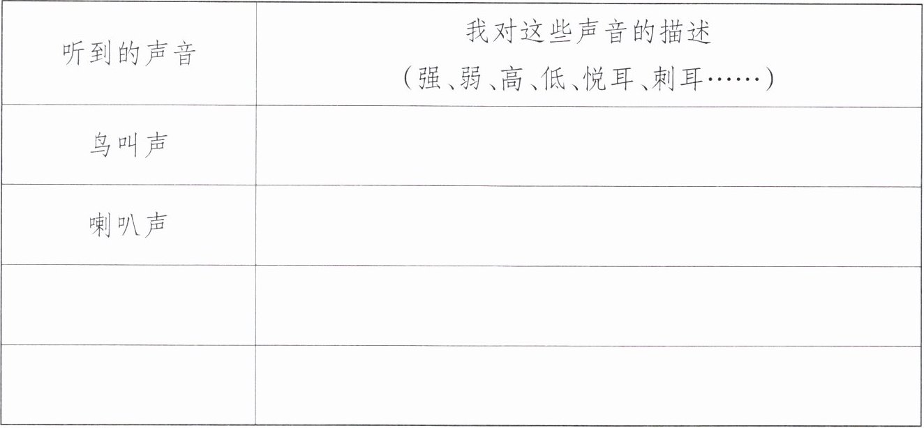 | 听到的声音 | 我对这些声音的描述 (强、弱、高、低、悦耳、刺耳……) |