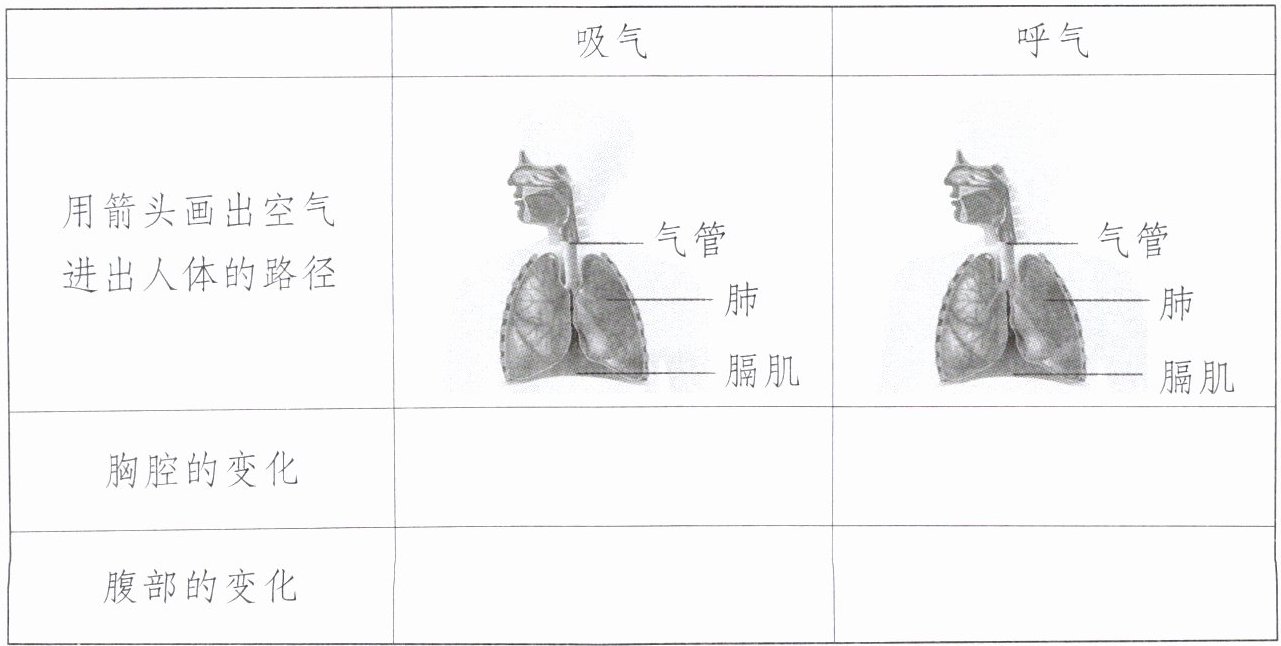 | 用箭头画出空气进出人体的路径 | 外界$\rightarrow$鼻$\rightarrow$咽$\rightarrow$喉$\rightarrow$气管$\rightarrow$支气管$\rightarrow$肺 | 肺$\rightarrow$支气管$\rightarrow$气管$\rightarrow$喉$\rightarrow$咽$\rightarrow$鼻$\rightarrow$外界 |