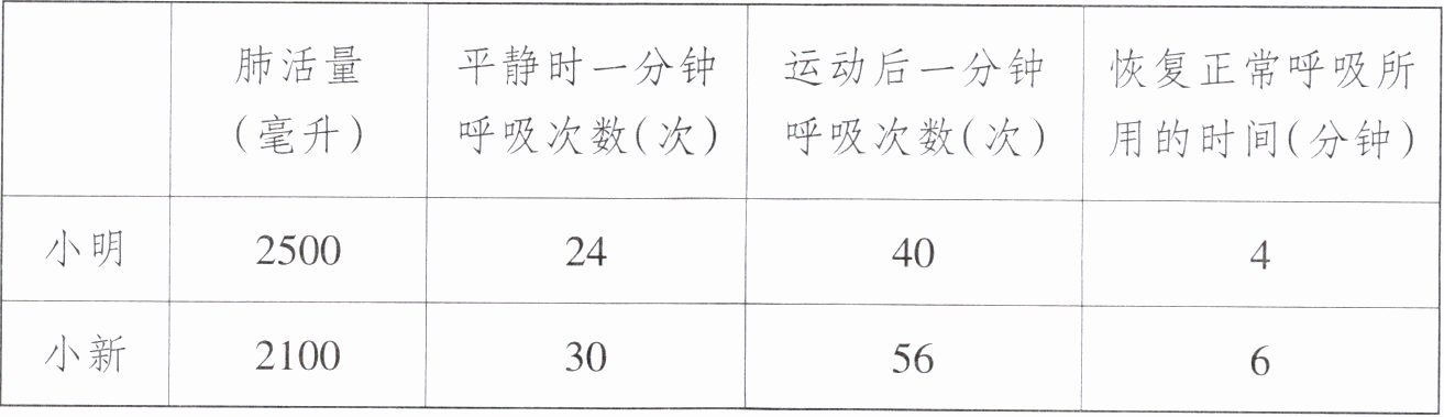 (2)肺活量是指在不限时间的情况下,一次最大吸气后再尽最大能力所呼出的气体量。经常锻炼的人,呼吸肌发达,胸廓活动范围大,肺活量较大。小明爱运动,小新不爱运动,所以经常锻炼的同学往往比不爱锻炼的同学肺活量大。肺活量大的人,在运动后能更高效地进行气体交换,从而更快地恢复正常呼吸,因此小明运动后恢复正常呼吸所用的时间比小新短。