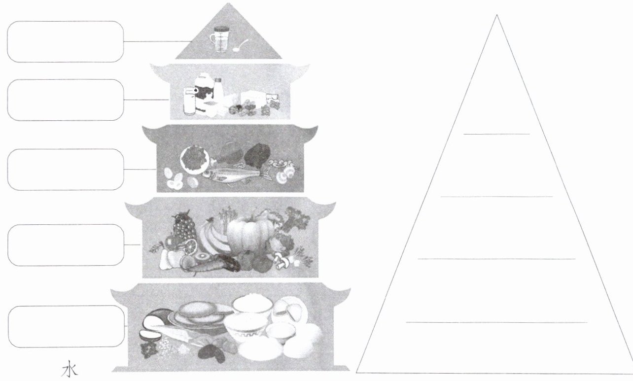(2)回忆前一天你吃了哪些食物,把食物名称填写到上图右侧的空白"宝塔"中。