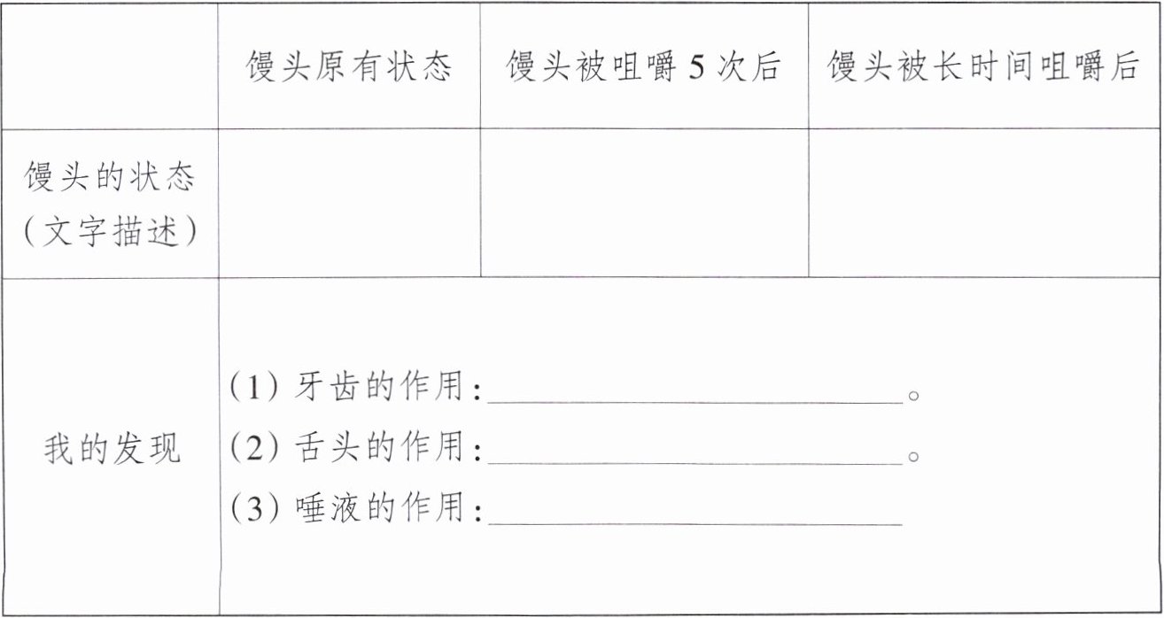 | 馒头的状态(文字描述) | 块状,较干,有一定硬度 | 小块状,开始变湿 | 糊状,湿润,有甜味 |