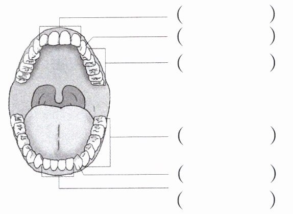 (1)照镜子或者同学之间互相观察对方的牙齿,在右图中写出各类牙齿的名称。