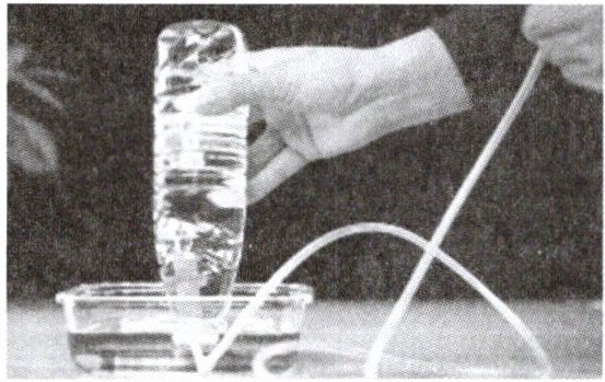 (4) 用手盖住瓶口并将其倒扣在小水缸里,确保瓶口在水面以下,然后从软管另一端吹气。