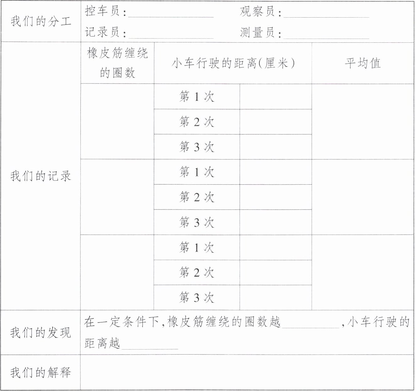 |我们的发现|在一定条件下,橡皮筋缠绕的圈数越多,小车行驶的距离越远|