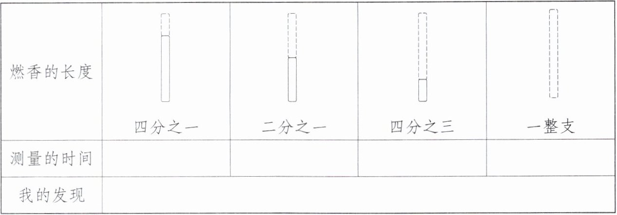 【解析】:本题主要考查对时间流逝与燃香长度关系的观察和理解。通过观察不同燃香长度所对应的时间,可以发现燃香燃烧的速度是均匀的,即相同长度的燃香燃烧完所需的时间是相同的。因此,可以通过测量燃香的长度来估算时间。在这个问题中,需要观察并记录不同燃香长度对应的时间,然后分析数据,得出结论。