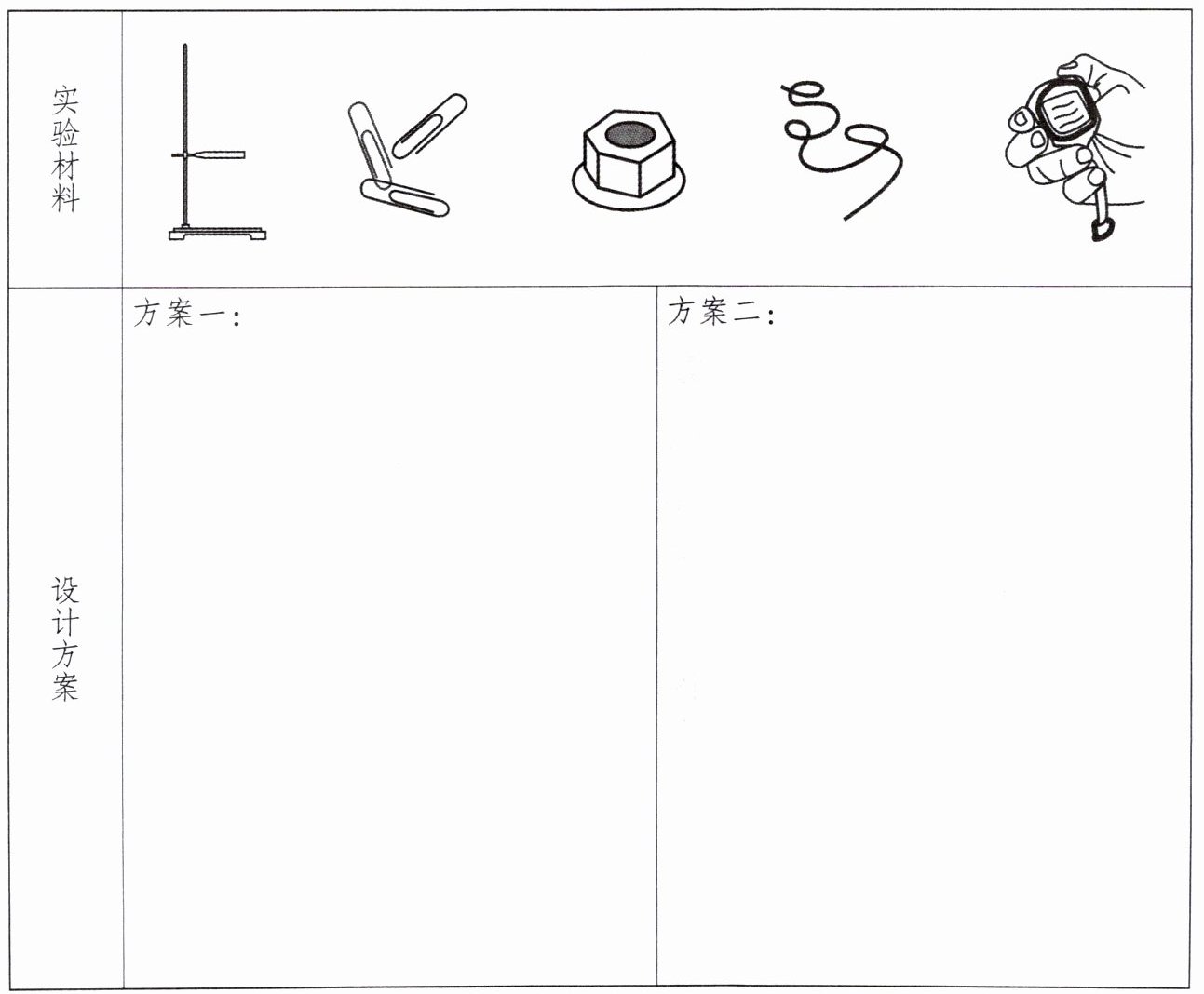 @@|实验材料|铁架台、回形针、螺母、绳子、秒表||设计方案|方案一:用回形针将螺母固定在绳子一端,绳子另一端系在铁架台横杆上,调整绳子长度,用秒表测量不同长度钟摆1分钟摆动次数。方案二:用回形针将多个螺母固定在绳子同一位置(改变摆锤重量),系在铁架台横杆上,保持绳子长度不变,用秒表测量不同重量钟摆1分钟摆动次数。|