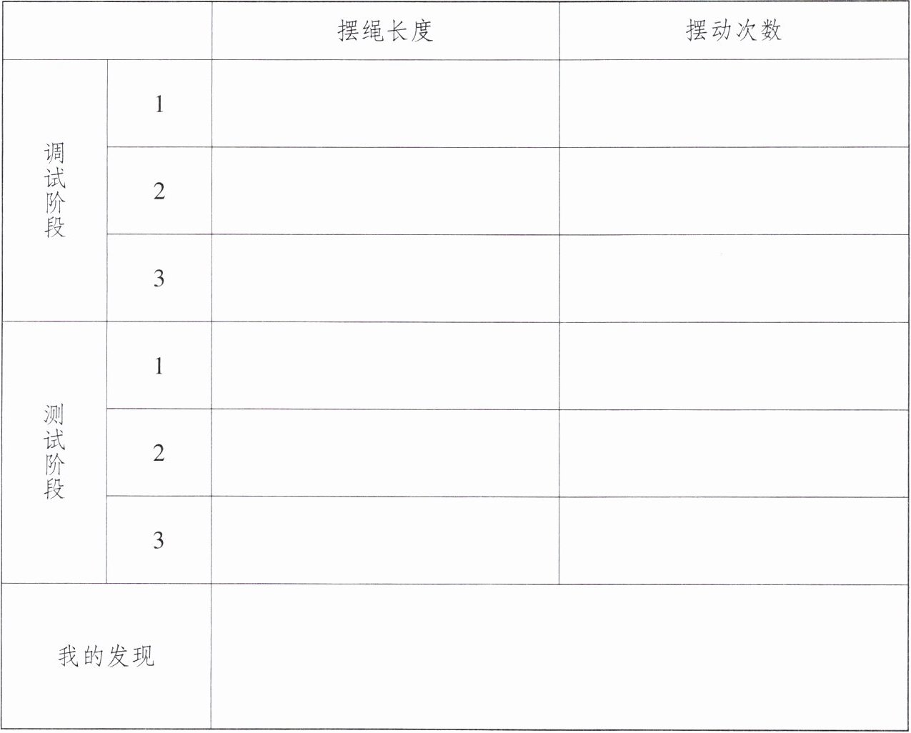 @@【解析】:这是一个科学实验题,考查的是对钟摆摆动次数与摆绳长度关系的理解,通过实际操作和记录数据来探究规律,属于科学探究中的实验操作与数据分析知识点。解题方法是通过动手组装钟摆,改变摆绳长度,记录不同长度下摆动的次数,然后分析数据得出结论。【答案】:| | | 摆绳长度 | 摆动次数 || --- | --- | --- | --- || 调试阶段 | 1 | 例如20厘米(可自行设定) | (实际摆动次数,如15次/15秒) || | 2 | 例如15厘米 | (实际摆动次数,如18次/15秒) || | 3 | 例如25厘米 | (实际摆动次数,如13次/15秒) || 测试阶段 | 1 | 与调试阶段1相同长度 | (实际摆动次数,应与调试阶段1相近) || | 2 | 与调试阶段2相同长度 | (实际摆动次数,应与调试阶段2相近) || | 3 | 与调试阶段3相同长度 | (实际摆动次数,应与调试阶段3相近) || 我的发现 | | | 摆绳越短,摆动次数越多;摆绳越长,摆动次数越少。 |注:摆动次数需根据实际实验情况填写,上述摆绳长度和摆动次数仅为示例。