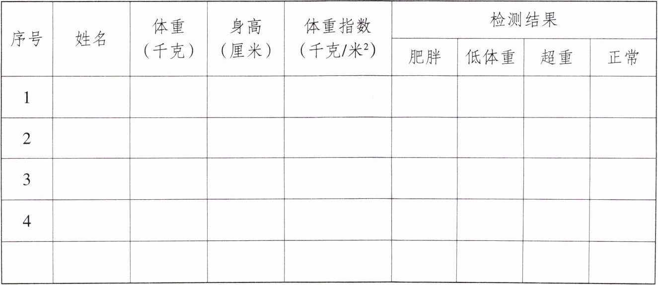 1. 小组学生身体健康自主检测实验记录表。(提示:课前在教室四周准备好检测需要的工具设备,如家用体重秤、身高测量尺)