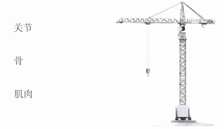 3. 连一连:塔吊的哪一部分与我们身体中的关节、骨和肌肉的作用相似,把相似的部位连起来。