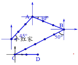1. 画出小红行走的路线图。小红先向北偏东$45^{\circ }$方向行走150米到达A地,又向东偏南$30^{\circ }$方向走150米到达B地,再向南偏西$50^{\circ }$方向走250米到达C地,又向正东方向走100米到达D地。