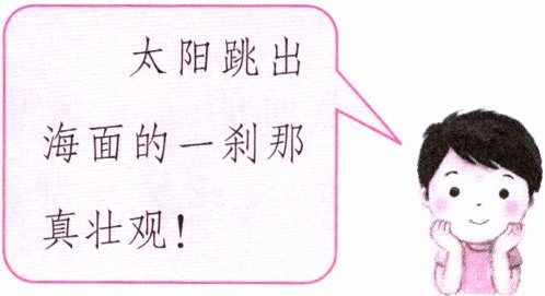 果然,过了一会儿,在那个地方出现了太阳的小半边脸,红是真红,却没有亮光。这个太阳好像负着重荷似的一步一步、慢慢地努力上升,到了最后,终于冲破了云霞,完全跳出了海面,颜色红得非常可爱。一刹那(chà)间,这个深红的圆东西,忽然发出了夺目的亮光,射得人眼睛发痛,它旁边的云片也突然有了光彩。