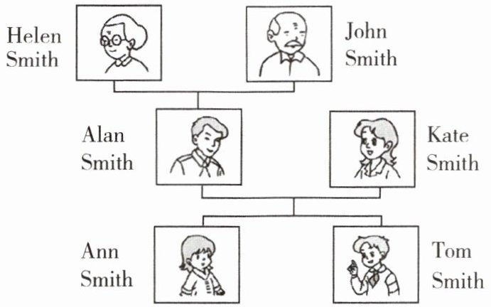 Hello,I'm Tom Smith. I have a happy 1. ______(家庭). John is my 2. ______(爷爷) and Helen is my grandmother. Alan and Kate are my 3. ______(父母). 4. ______(谁) is the girl? Oh,she is my 5. ______(姐;妹). Her name's Ann.