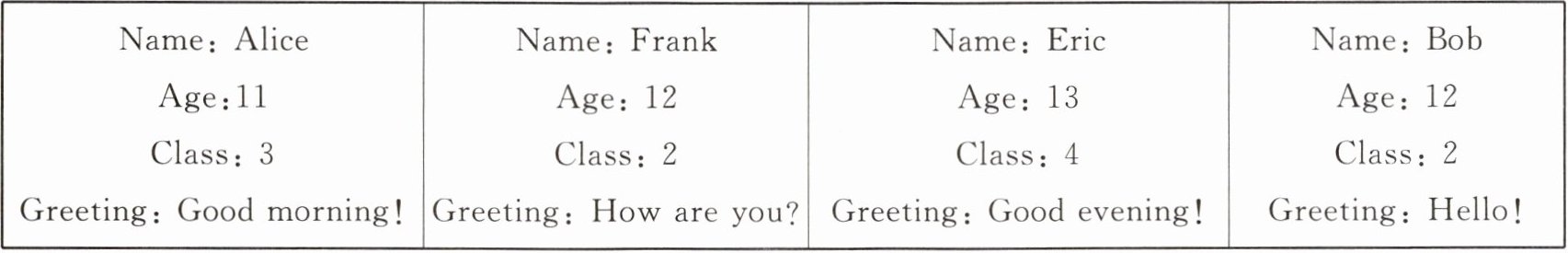 | Name: Alice Age: 11 Class: 3 Greeting: Good morning! | Name: Frank Age: 12 Class: 2 Greeting: How are you? | Name: Eric Age: 13 Class: 4 Greeting: Good evening! | Name: Bob Age: 12 Class: 2 Greeting: Hello! |