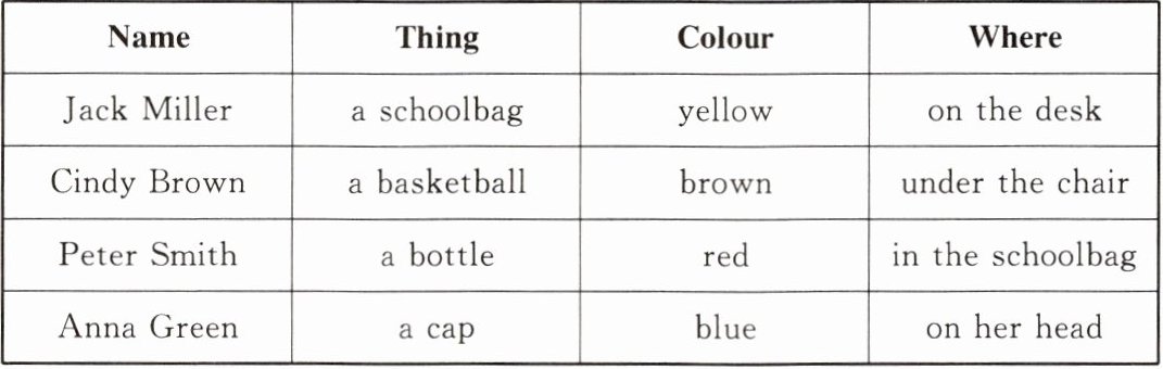| Jack Miller | a schoolbag | yellow | on the desk |