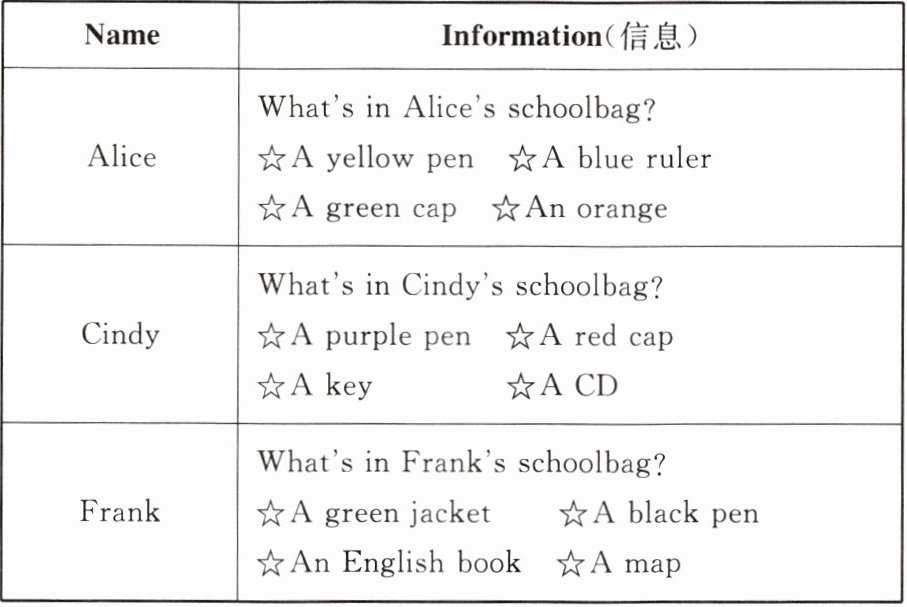 | Alice | What's in Alice's schoolbag? ☆A yellow pen ☆A blue ruler ☆A green cap ☆An orange |