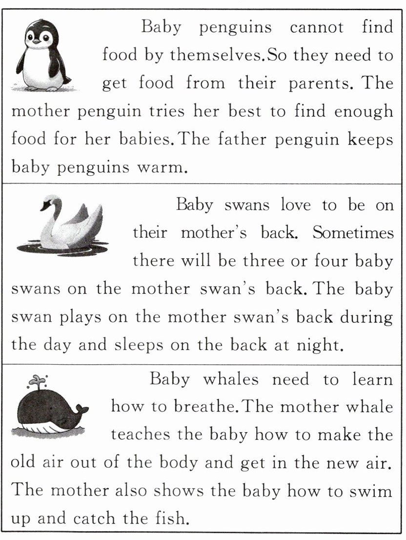 ||Baby penguins cannot find food by themselves.So they need to get food from their parents. The mother penguin tries her best to find enough food for her babies.The father penguin keeps baby penguins warm.|