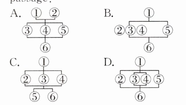 29.D【思路点拨】文章结构题。通读全文可知,文章第一段介绍了中国新型高速列车 CR450 的速度优势,第二至五段讲述了 CR450 的优点,最后一段总结了人们对 CR450 的期待。故选 D。