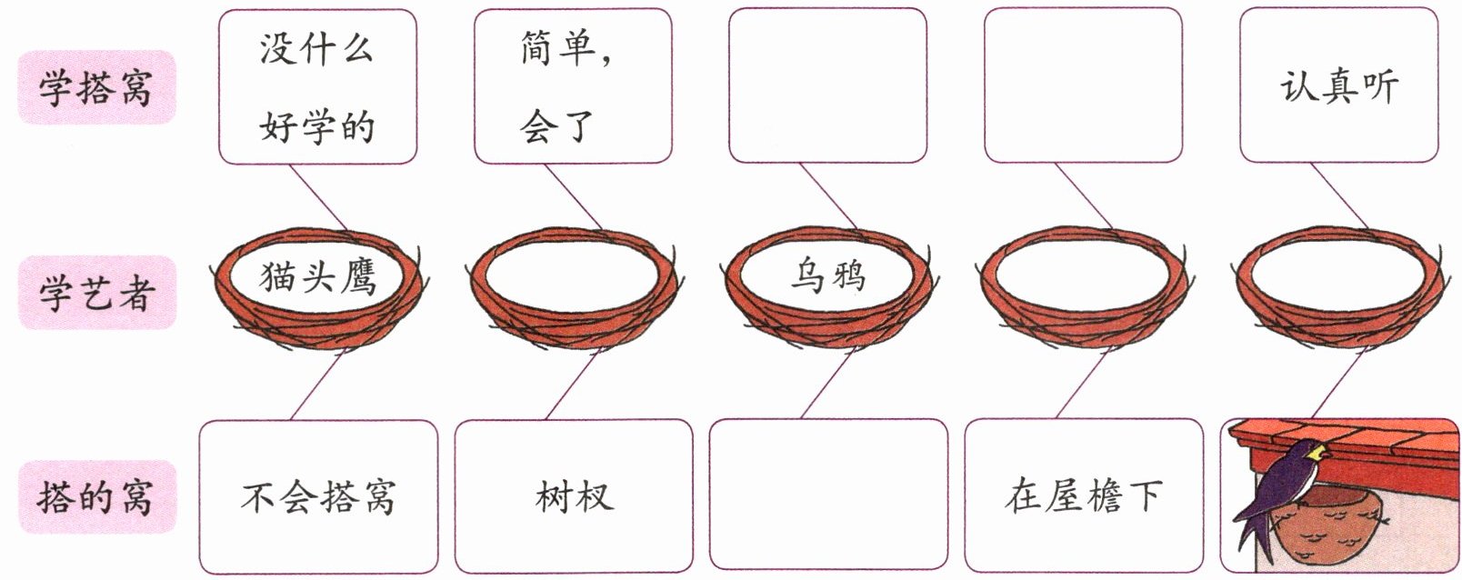 许多鸟听说凤凰会搭窝,就都到它那儿去学本领。