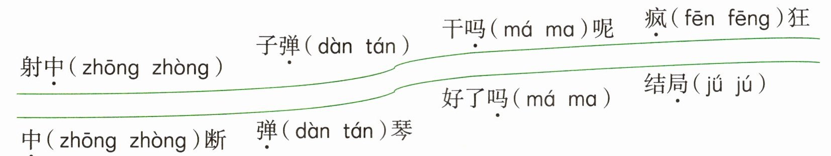 zhòng zhōng dàn tán má ma fēng jú【解析】本题考查字音。“中”读“zhōng”时表示方位、位置在两端之间;读“zhòng”时有正对上、恰好合上、受到、遭受的意思,“射中”表示射击正中目标物,所以读“zhòng”,“中断”的“中”读“zhōng”。“弹”读“dàn”时表示子弹、枪弹,读“tán”时则表示用手指弹击、发射,根据文意,“子弹”的“弹”读“dàn”,“弹琴”的“弹”读“tán”。“吗”表示疑问代词“什么”时读“má”,如“干吗”;用在句末表示疑问时读“ma”,如“好吗”。“疯狂”的“疯”是后鼻音,读“fēng”。“结局”的“局”读“jú”,韵母“ü”与声母“j”组合在一起时要写作“u”。