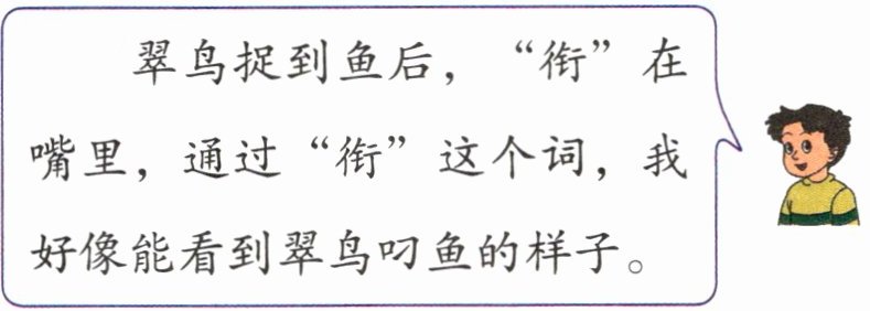 翠鸟捉到鱼后,“衔”在嘴里,通过“衔”这个词,我好像能看到翠鸟叼鱼的样子。