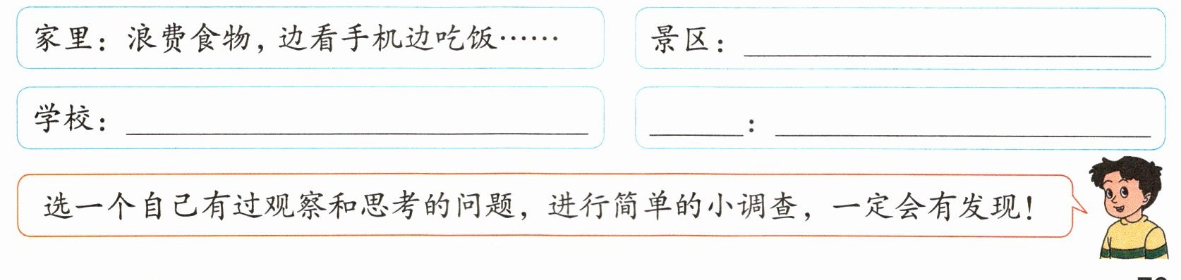 家里:浪费食物,边看手机边吃饭…… 景区:______